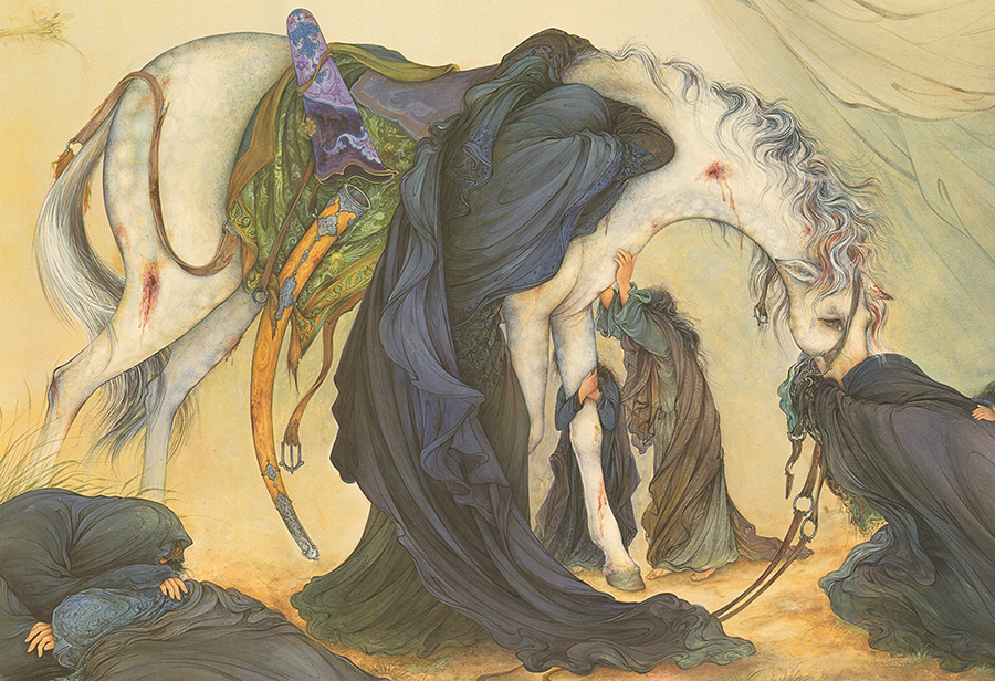 Known as ‘The Evening of Ashura’ (عصر عاشورا, ʿasr-e ʿAshura, henceforth simply “Asr-e Ashura”), this painting depicts the afternoon of 10 Moharram 61/10 October 680, the day when Hosayn b. ʿAli, the third Emam, was martyred in the Battle of Karbala (modern Iraq). Created in 1355 Sh/1976 by the renowned painter and master designer Mahmoud Farshchian, the painting illustrates the moment when Hosayn’s horse Zoljanah (ذوالجناح) returns to the tents of the Ahl-e Beyt (اهل بیت, the family of the Prophet Mohammad) without him. Wearied and wounded, as shown by the two punctures on its body, blood-stained mane, and visible tear in its eye, the horse is surrounded by four women and three children. Zoljanah carries the green ʿabaʾ (a traditional loose-fitting garment) of Hosayn and his empty scabbard, both symbolizing the Emam’s presence in the scene’s center (fig. 1). Although the faces of the women and children are not shown, they are presumably members of Hosayn’s family, probably Zeynab (his sister), Umm-e Kulthum (his sister), Sakineh (his daughter), and others. The outlines of tents flank the figures on the right, while vividly drawn palm trees on the left and sparse desert vegetation in the foreground evoke the geography of the hot and arid desert of Karbala.