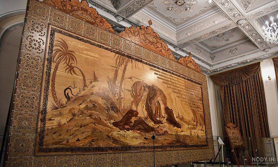 Beyond his original works in these two museums and others worldwide (see this list), Farshchian’s paintings have achieved widespread recognition through reproductions. “Asr-e Ashura,” in particular, has been widely copied, appropriated, and reproduced across various media, particularly during its extended popularity after the Iranian Revolution in 1979. Alongside the original painting, the Astan-e Qods-e Razavi Museum preserves several replicas, including a moʿaragh-kari (معرقکاری, wood inlay) and carpet tableau (تابلو فرش), each labeled with the artist’s name and year of donation (see this link) (fig. 5).