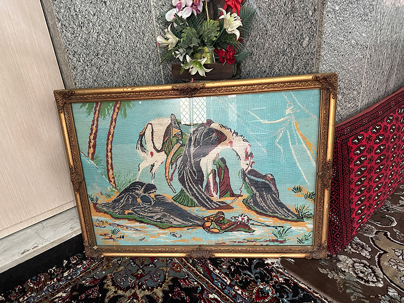 The act of reproduction has made “Asr-e Ashura” more accessible and enabled it to become a versatile presence in many Iranian streetscapes and sacred spaces. Murals in Tehran and Rasht modify and enlarge the painting for visibility in urban space, allowing it to reach a broader audience (fig. 6). Portable versions are also common sights in emamzadehs and other religious spaces. At the Emamzadeh ʿAli in Varamin, a small replica is propped up against the dado of the tomb (fig. 7, vid. 1) (also see City Tour). This gobelin needlepoint tapestry preserves the painting’s outline and composition, making it immediately recognizable to Shiʿi mourners and pilgrims. Posters and reproductions of “Asr-e Ashura” are also part of global collections, including two examples in the V&A Museum in London (ME.6-2011 version A; ME.6-2011 version B). While the proliferation of replicas has popularized Farshchian’s “Asr-e Ashura,” it has inevitably compromised the original work’s details and medium.