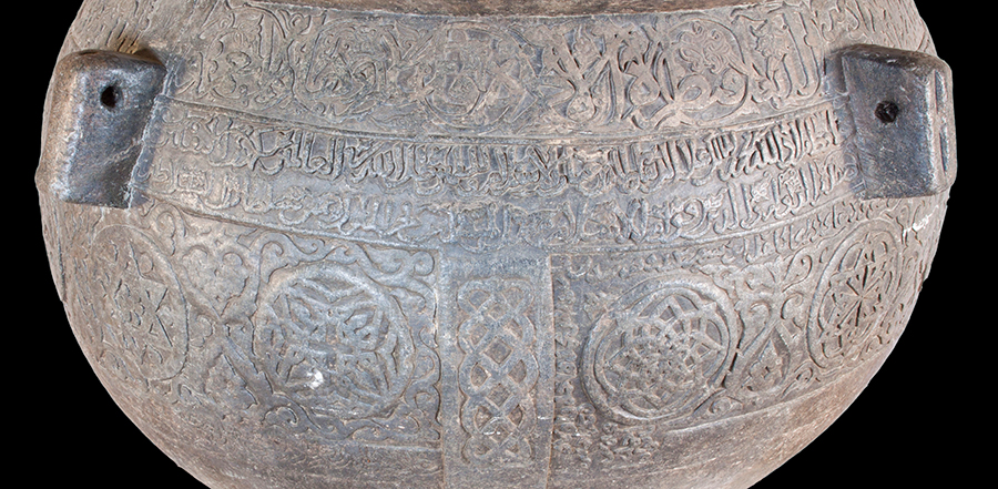 Iran, Kharazmshahi period, 1200–13 Black serpentine H. 3.6 ft. × D. 4.49 ft. (H. 110 × D. 137 cm) Astan-e Qods-e Razavi Museum, Mashhad, no. 21 Photograph ©︎ Organization of Libraries, Museums and Documents Center of Astan-e Qods-e Razavi