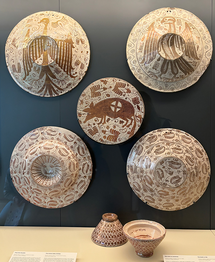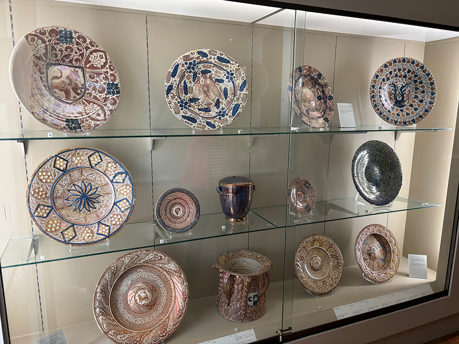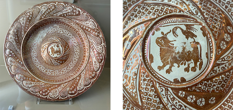 It is surprising and intriguing to find two Iberian luster dishes at the top of this case, which otherwise displays examples of Iranian lusterware in Richard’s collection. Though we cannot see the details of their designs very clearly, we can see enough to assign them as productions of the Valencia region (map) in the late fifteenth or early sixteenth centuries. This is when the potteries of this region took over from the Islamic industry that had flourished under Nasrid rule (1232–1492) at the pottery center and port of Málaga. Now operating under the patronage of the Christian lords of Aragón, the scale of production and export truly exploded. Such vast numbers were exported to Italy that when Italian potters finally discovered how to make the technique of tin-glazed lusterware themselves, the bottom fell out of the Spanish market, and lusterware became a primarily local industry. It continued to be made into the eighteenth century, and on a small scale into the nineteenth century, when it was consciously revived in the spirit of national craft revivals (Rosser-Owen 2022b).