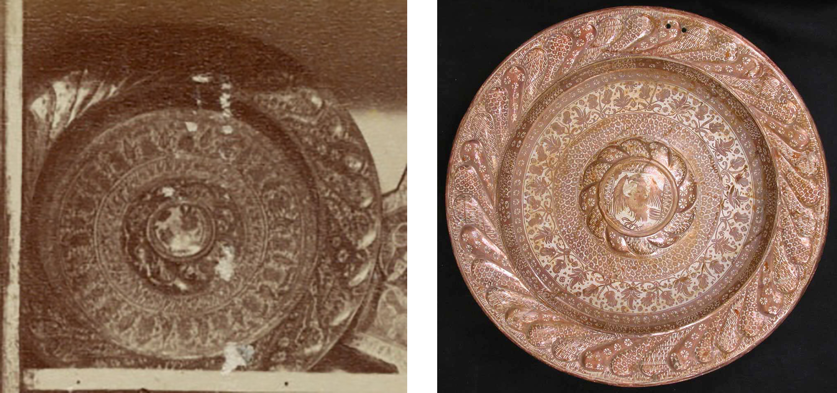 So far, we have not been able to trace the present whereabouts of these two dishes. Valencia lusterwares were produced on a massive scale, and their decoration is often generic and repetitive. In terms of what we can tell from Sevruguin’s photograph, dish A appears to be a brasero, the kind of deep-sided dish like an example in the Metropolitan Museum of Art in New York (fig. 7). The way the shadow falls in the photograph implies a deep dish, as does the narrowness of its rim. It is also decorated with ‘gadrooning,’ a very common device on the Valencia lusterwares, executed in slight relief, probably by being placed in a mold, and a bit like repoussé in metal objects. There is a raised boss at the center of the dish with a device that cannot be clearly read. This is likely a coat-of-arms and could be a generic design or identify the patron for whom the dish was originally made. Surrounding this boss are three or possibly four bands of different designs, which are difficult to see clearly in the photograph (for a detail of such bands, see fig. 4).