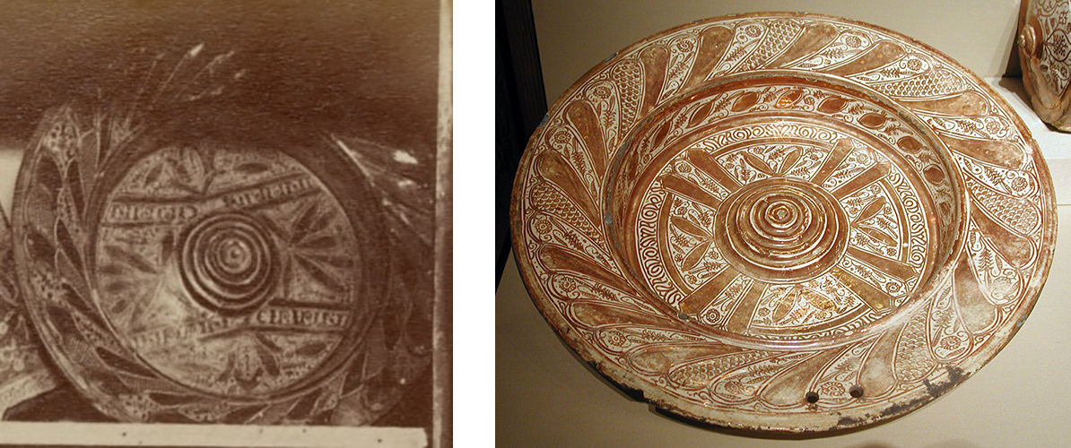 The lack of figurative decoration associates this group of luster objects with the category of ‘Mudéjar’ art – a term coined in the nineteenth century to distinguish objects and buildings in an ‘Islamic’ style or technique from those that were perceived to be natively Spanish/Iberian. The term also implies that only someone who identified as ‘Muslim’ could have made or appreciated art in this style, when there are so many examples of this being far from the case. As such, it is a term that art historians of medieval Iberia do not like to use. Similarly, the term ‘Hispano-Moresque’ is going out of fashion. This was coined in 1861 by Baron Jean-Charles Davillier (1823–83), a French writer and collector who wanted to make a racial distinction between ‘Arab’ (‘Hispano-Arab’) and ‘Moor’ (‘Hispano-Moresque’), referring to the indigenous populations of North Africa who formed such a strong proportion of the Muslim population of al-Andalus (as Islamic Spain was called in Arabic) (Davillier 1861). Today, we prefer to be more historically specific in how we refer to particular types of artistic production and production centers (figs. 4–5).