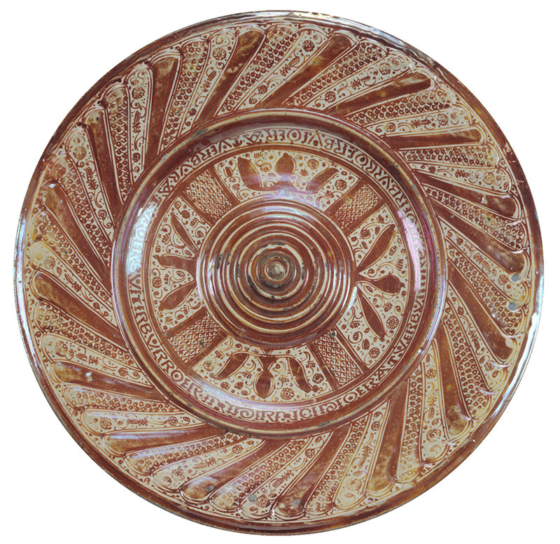 The later lusterwares tend to use increasing amounts of copper in their recipes, presumably because without their international export markets, the makers could not afford so much expensive silver (Dectot, Makariou and Miroudot 2008, p. 115). Their designs were predominantly vegetal, based on plant ornaments, and several patterns might be combined on a single vessel, as in dish A here. If they featured figurative decoration, this tended to be located on the dish’s reverse, indicating that, when not in use, they were probably displayed on a wall or credenza-like dresser with their reverses facing outwards (fig. 3). It is notable that most larger examples of Iberian lusterware have two small suspension holes in their rim. The presence of glaze inside these holes confirms that they were punctured before the vessels were fired, indicating that suspension and display were anticipated at the point of making.