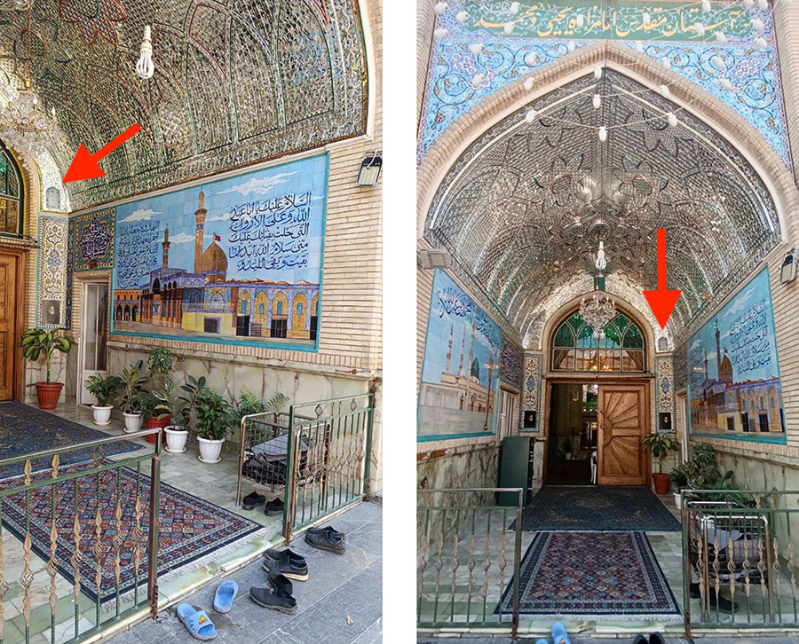 At least thirteen known examples of Type I tombstones survive, either in museum collections and without clear provenance or in situ in religious monuments, including in Kashan (Ghiasian and Mashhadi Noosh-Abadi 2022, 10–11) and this example in Tehran. Meanwhile, at least four examples of Type II tombstones remain in situ in religious buildings in Yazd. In the Boqʿeh-ye Seyyed Shams al-Din (map), for instance, a ceramic tombstone for Seyyed Hosayn features an inscription composed of Persian verses specially composed for the deceased (fig. 4). These verses include his name and the year of his death encoded through abjad numerals. The phrase مکان حسین آمده قصر جنت (The palace of paradise has arrived at the place of Hosayn) in the last line corresponds to the year 1132/1719–20. The tombstone is currently installed at the back of the eyvan leading into the Boqʿeh-ye Seyyed Shams al-Din (fig. 5).