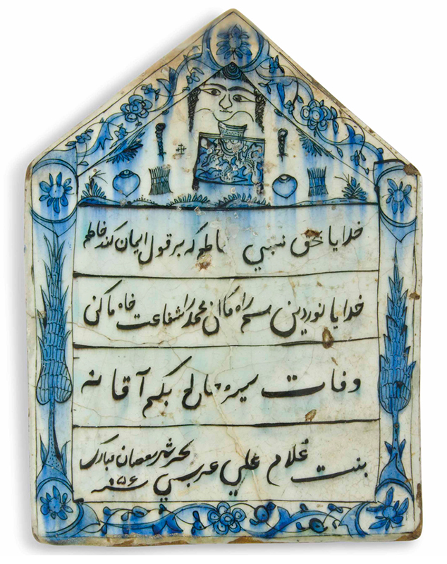 The use of Persian poetry on Iranian ceramic tombstones became increasingly popular from the last quarter of the sixteenth century, gradually replacing the Qurʾanic verses, Hadith quotations, and Arabic prayers for the Fourteen Infallibles (the Prophet Mohammad, his daughter Fatemeh, and the Twelve Emams) commonly inscribed on late fifteenth- and sixteenth-century tombstones (for a 992/1584–85 example in the Emamzadeh Yahya at Varamin, see Sheikhalhokamaee’s essay, no. 1). Between the late sixteenth and early eighteenth centuries, two distinct types of Persian verses emerged almost simultaneously on underglaze-painted ceramic tombstones: poetic excerpts from the works of renowned poets, carefully chosen for their appropriateness to a funerary context (Type I), and madda tarikhs (chronogram poems), specially composed verses incorporating the name of the deceased and/or abjad numerals (numerical values assigned to letters) (Type II).