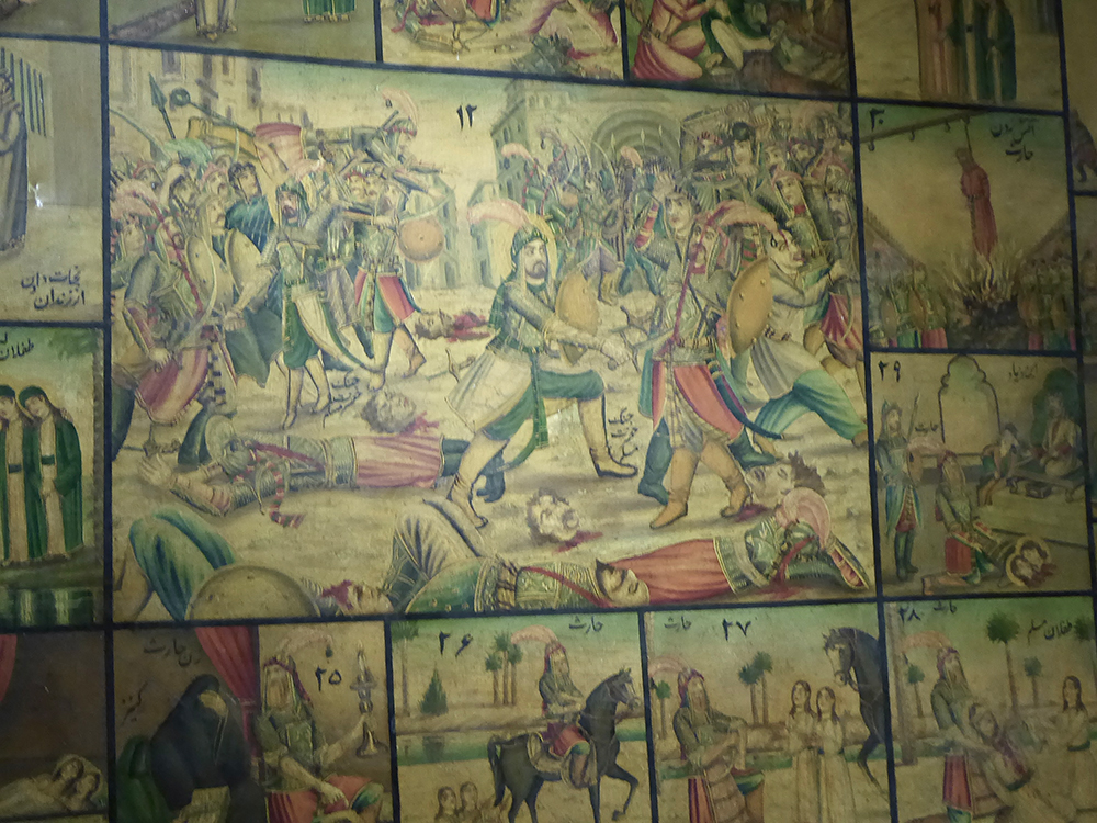 The tragic events of Karbala also found dramatic expression in taʿziyeh (تعزیه), Shiʿi devotional drama that takes place in special buildings called tekiyeh (تکیه) or hosayniyeh (حسینیه) (see cat. nos. 46–47). The practice of decorating the walls of tekiyehs with wall paintings can be traced back to the Tekiyeh Dowlat, the royal amphitheater inaugurated in 1867 in the Golestan Palace (Chelkowski 1989, p. 99–100). A recent example can be seen in the tekiyeh of the Tajrish bazaar in Tehran (figs. 3–4).