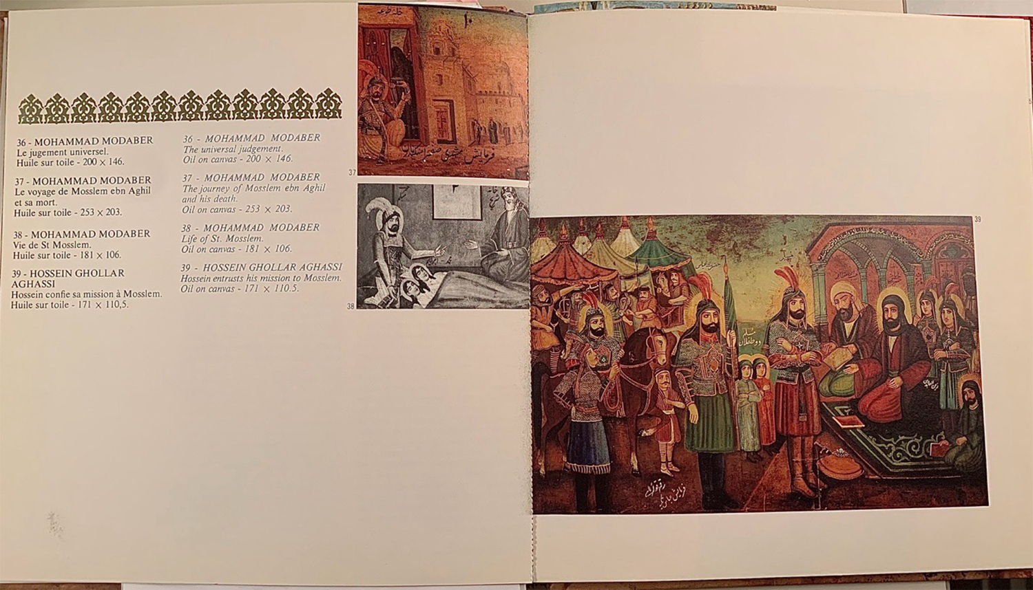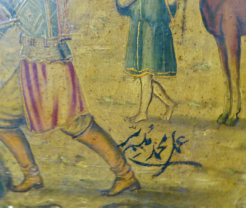 Mohammad Modabber and his teacher Hosayn Qullar Aqasi (d. 1966) are viewed as the two great masters of the coffeehouse painting tradition (for biographies of both, see Seyf 1990, p. 23–39 and 43–56). Since the Safavid period (1501–1722), the coffeehouse was an important gathering space for artists, poets, intellectuals, and statesmen. In the month of Moharram, the coffeehouse would host special recitations and reenactments of the events leading up to the martyrdom of Emam Hosayn (Al-e Dawud 1992.)