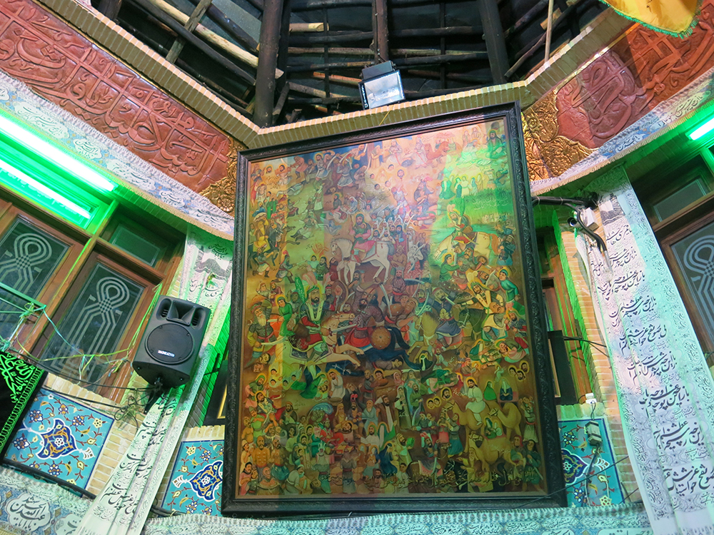 Naqqashi-ye qahveh-khaneh (نقاشی قهوهخانه, coffeehouse painting) is a modern genre of narrative painting depicting scenes from Shiʿi martyrology as well as epics and romances from the Persian literary tradition. This painting was carried out by Mohammad Modabber (d. 1967) for Mashhadi Safar Eskandariyan’s coffeehouse located in the Sayyed Esmaʿil Bazaarcheh (map) (Aslani 2022). Modabber made multiple works depicting the story of Moslem b. ʿAqil’s ill-fated journey to Kufeh (Kufa), which ultimately resulted in his death in September 680 and the tragedy of Karbala the following month. Modabber is known to have stated, “Until one, like the honorable Moslem, has had the bitter taste of cowardice and betrayal […] one would not be able to hold a finger of astonishment to one’s lips” (Seyf 1990, p. 112).