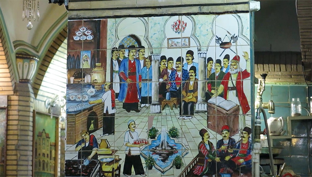 An intriguing series of nested allusions to the coffeehouse experience can be found in the coffeehouse of a sofreh-khaneh (سفرهخانه, traditional restaurant) in Tehran (map) (fig. 8). A large tiled panel near a small kitchen area depicts a naqqali (storytelling) gathering in a coffeehouse. In the background (see the middle arch), a coffeehouse painting of the battle of Rostam and Asbolus, a legendary scene from Ferdowsi’s (d. 1020) Shahnameh (Book of Kings), can be seen. In an interview recorded in this space, a morshed (teacher) who was active as a storyteller in the post-revolutionary years, describes how he would lay out his pardeh and draw in his audience (audio 1). At the end of our discussion, he points to the tiled panel to help set the scene, confirming the central link between Iranian storytelling and its visual mediums.