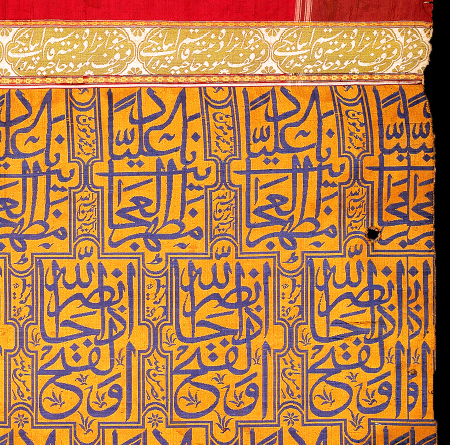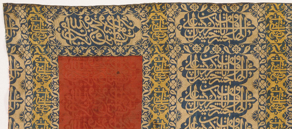 Several surviving Safavid (1501–1722), Ottoman (ca. 1299–1922), and Qajar (1779–1924) textiles attributed as tomb covers are characterized by their complex and dense patterns of epigraphy, and many of them may have been designed as banners (Mashhadi Noosh Abadi and Ghiasian 2024; Blair 1998, p. 179–80; The Arts of Islam 1976, p. 109). Repeated bands of inscriptions arranged in stripes, zigzags, and around or inside cartouches contain Qur’anic citations, prayers to the Prophet and Shiʿi Emams, and at times commissioned poetry, historical information about the endowment, or signatures of craftspeople (figs. 8–9; see fig. 2). Mirror writing was also common, as can be seen in a silk textile attributed to the 1600s that may have been used as a tomb cover (fig. 9) and a similar Qajar-period example found in Esfahan and preserved in Iran’s National Museum (no. 20223) (Mashhadi Noosh Abadi and Ghiasian 2024, p. 53–54). Both contain repeated bands of the verse ‘help from Allah and an imminent victory’ (نصر من الله و فتح قریب; Q 61:13), and invocations to Emam Hosayn, among other inscriptions.
