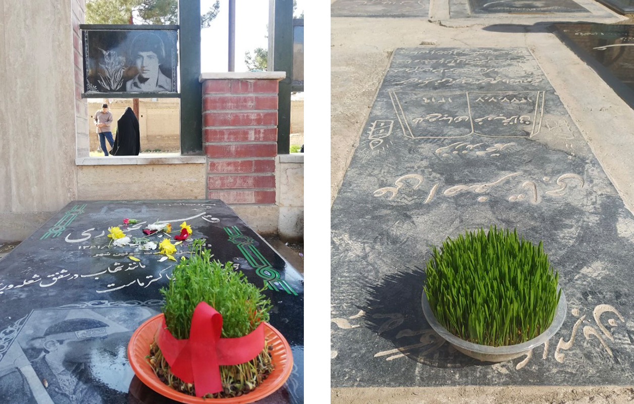 The tradition of visitation also extends to visiting the burial place of loved ones in cemeteries, holy shrines, and local emamzadehs, and it is customary to visit the deceased on the last Thursday before the beginning of the new year (figs. 5–6). To share the rituals of a new year, family members bring flowers (in some case an extra sabzeh), refresh the tombstone with water (or rosewater), and distribute food offerings as blessings for the passed soul. It is not uncommon for families to exchange condolences and offer their prayers for the deceased, but the overall sentiment of such visits is celebratory. The occasion is considered “a celebration of life and a good future, not of death and the past” (Loeffler and Freidl 2022, p. 33).