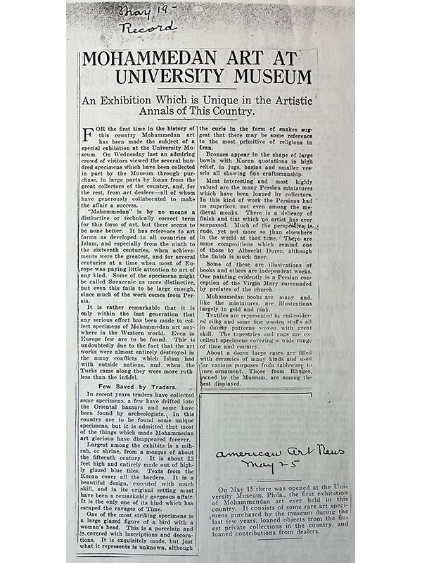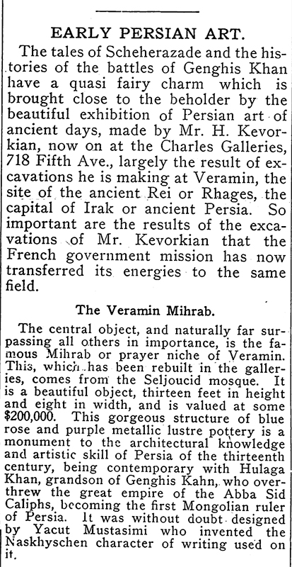 A contemporary newspaper article describes the exhibition as the result of Kevorkian’s excavations “at Veramin, the site of the ancient Rei or Rhages,” further confusing the two distinct cities located twenty-five miles apart (fig. 86). The “Veramin Mihrab” is lauded as the “central object” coming from “the Seljoucid mosque” and “valued at some $200,000.”