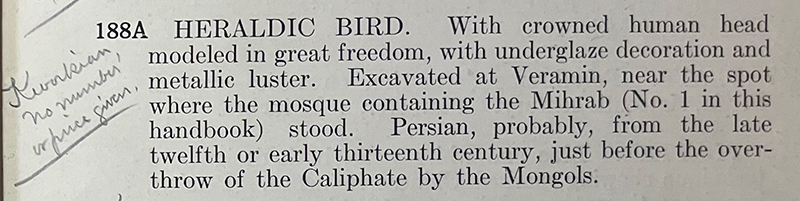 The exhibition also includes a large luster human-headed bird (harpy) belonging to Cora Timken Burnett (d. 1956) (fig. 101). In the catalog entry, Kevorkian mentions that the piece was “excavated at Varamin, near the spot where the mosque containing the Mihrab (No.1 in this handbook) stood” (fig. 102). This claim is questionable on several levels, and Kevorkian was clearly using Varamin and the mihrab as geographical and cultural references to heighten the appeal of other examples of luster. Moreover, his mention of “the mosque” might have perpetuated the misunderstanding that the mihrab came from the city’s congregational mosque.
