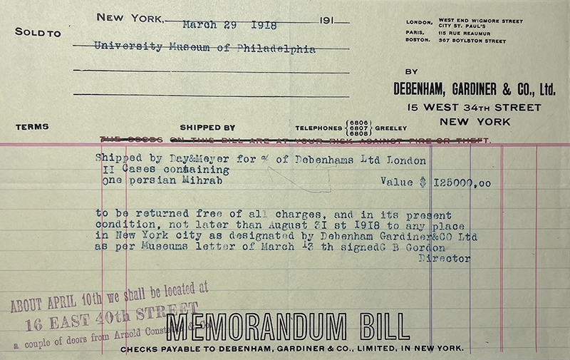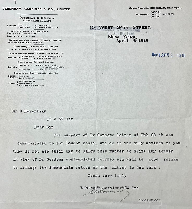 Kevorkian receives a letter from the New York branch of Debenhams, written in concert with “our London house,” and ordering him to arrange the “immediate return of the mihrab to New York” (fig. 103). This letter shows that Debenhams still played a—if not the—decisive role in the mihrab’s fate. Following the receipt of this letter, Kevorkian writes to Charles C. Harrison, head of the Board of Managers, insisting that the museum finally purchase the nine pieces of Persian art valued at $8,000 ($155,198 in August 2025), which would allow the mihrab to remain at the museum for another year, through 1 April 1920 (fig. 104). The museum finally pays the amount, and the mihrab ends up staying in the museum not just for one more year but two decades.