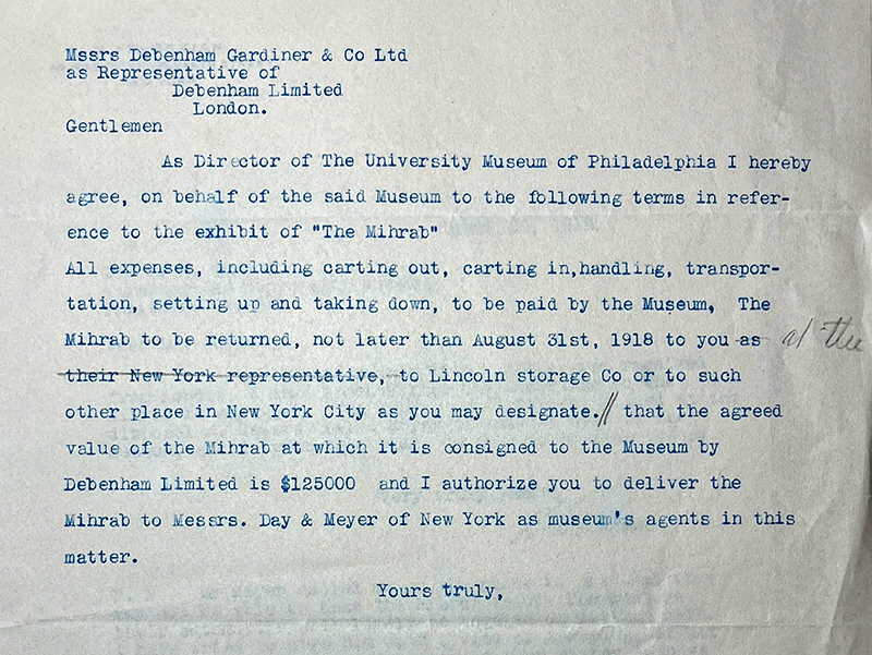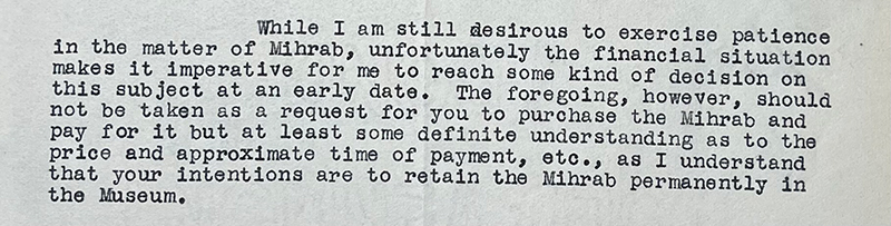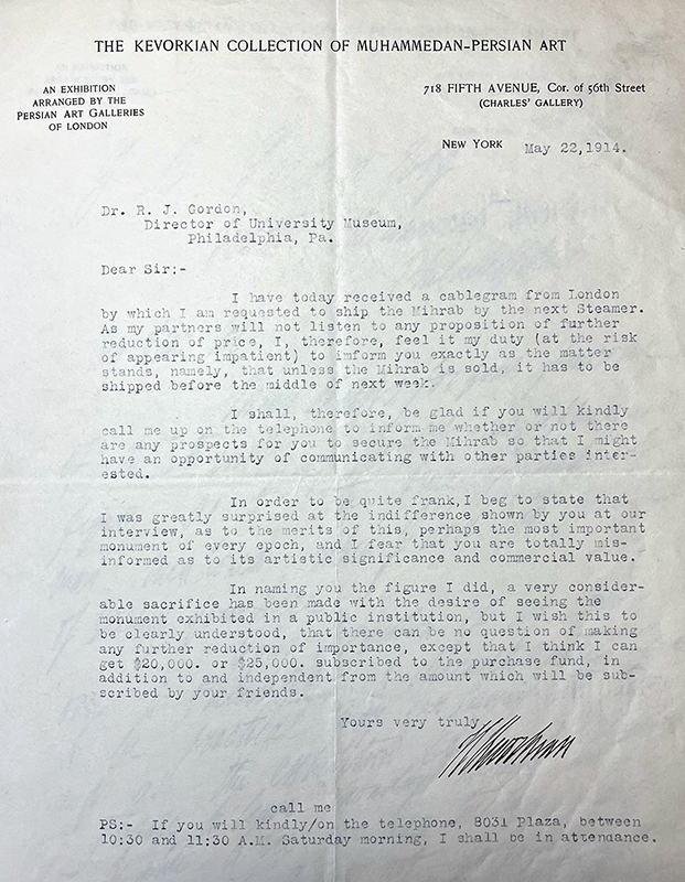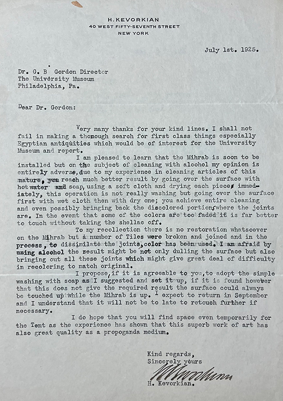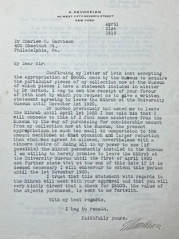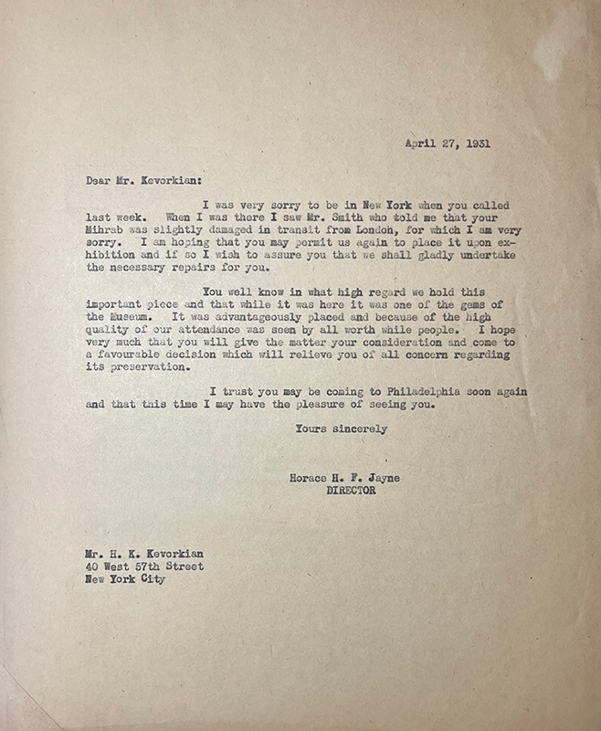 Although the mihrab remains in the Penn Museum for the next thirteen years, Gordon’s death likely plays a pivotal role in determining its ultimate departure from the institution. In the weeks following Gordon’s death, Jane M. McHugh, Secretary of the Board of Managers, reaches out to Kevorkian about his “property” in the museum, including the mihrab and sixteen other objects, including many works of ancient Egyptian art.148