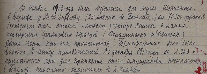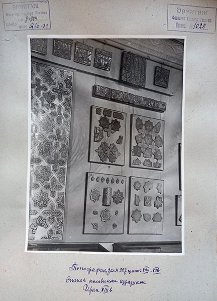 The large batch of tiles from the Emamzadeh Yahya acquired by the Stieglitz Museum in 1913 from Clotilde Duffeuty and stored in crates at the onset of the First World War are transferred to the State Hermitage Museum (map). Ernest K. Querfeld (d. 1949), curator and director of the Stieglitz Museum, writes a report to Joseph A. Orbeli (d. 1961), curator of the Near Eastern collections at the Hermitage, providing information about the 1913 acquisition (fig. 107).