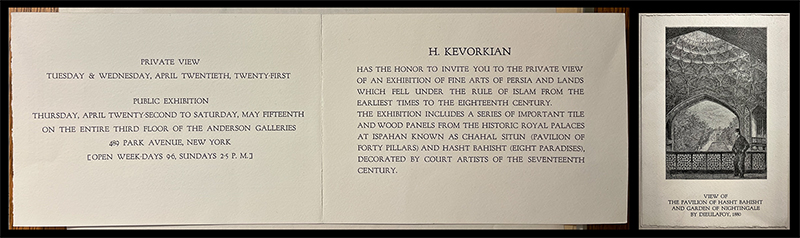 Kevorkian displays his Persian art collection at Anderson Galleries in New York (map). In advance of this exhibition, which was truly a sale, Kevorkian sends letters and private viewing invitations to many colleagues and potential buyers (fig. 109). He explains to Gordon (Penn Museum) that the purpose of the exhibition is “to afford to museum authorities and curators proper accommodation of inspection with minimum loss of time.”143 Kevorkian reserves several pieces for Gordon’s inspection, including a pair of doors said to be from the Chehel Sutun in Esfahan. He writes to the director, “I have been looking forward to have you see my collection of manuscripts and miniatures for a long time, I therefore, hope that you will not fail to honor me by visiting the exhibition.”144