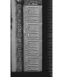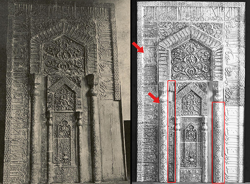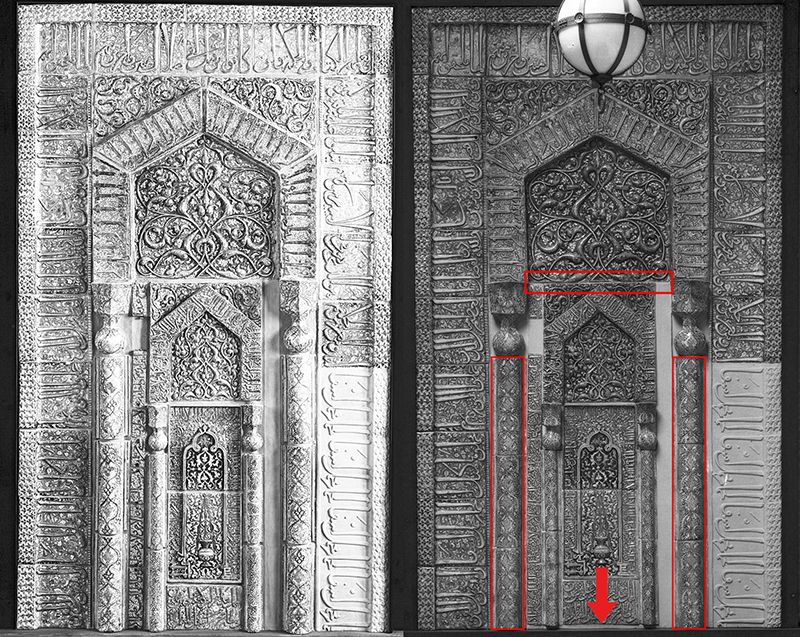 A comparison of the Penn Museum photograph to the one reproduced by Sarre in 1910 reveals that the mihrab had undergone some changes since entering Kevorkian’s possession (fig. 99). One notable change is the restoration of damaged areas visible in the older photograph, particularly along the outer border tiles. Some of the individual tiles are also rearranged. The three tiles comprising the bases of the large columns, with thin inscriptions along their edges, are altered, as are some of the thinner tiles framing the inner niche, which had already been disrupted in 1910.