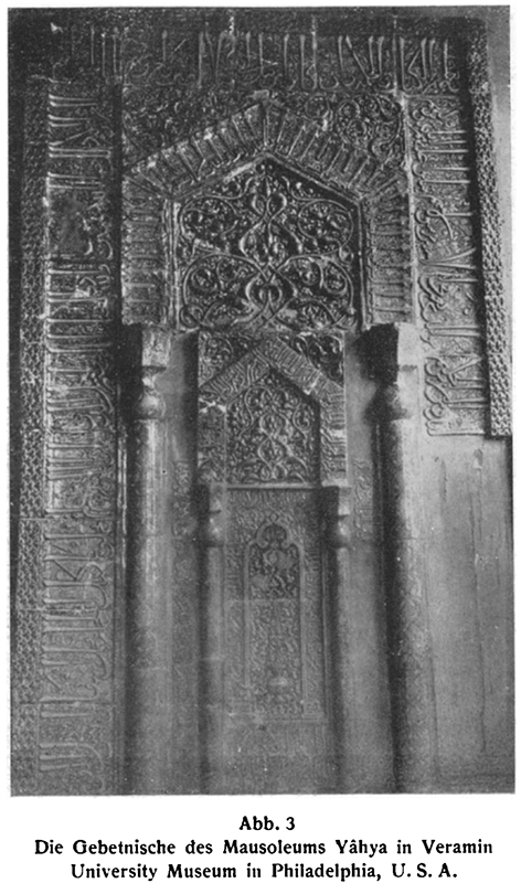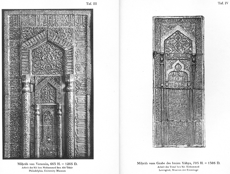 In an article written on the occasion of these acquisitions, Sarre reproduces the same photograph of the Emamzadeh Yahya’s mihrab that he first reproduced in 1910 (fig. 113). He draws a direct line between the West’s (Abendland) collecting of medieval Persian ceramics and the destruction of most of Iran’s mihrabs.150 He then highlights the Emamzadeh Yahya’s mihrab as the only other mihrab sent abroad relatively intact. The caption lists it as in the “University Museum in Philadelphia, U.S.A.”