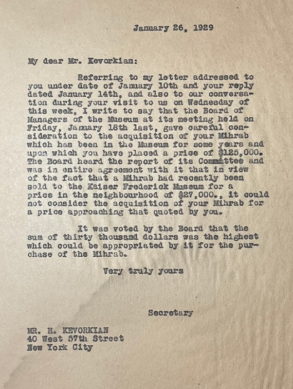 The Board of Managers of the Penn Museum, led by Charles C. Harrison, reaches a decision about the purchase of the mihrab. After “careful consideration,” the Board concludes that Kevorkian’s asking price of $125,000 is far too high. As a point of comparison, they cite the sale of the Masjed-e Meydan’s mihrab to the Kaiser Frederick Museum in Berlin for $27,000 (see 1927–28) (fig. 114). The maximum amount that the museum can offer for the Emamzadeh Yahya’s mihrab is $30,000 ($568,378 in August 2025).