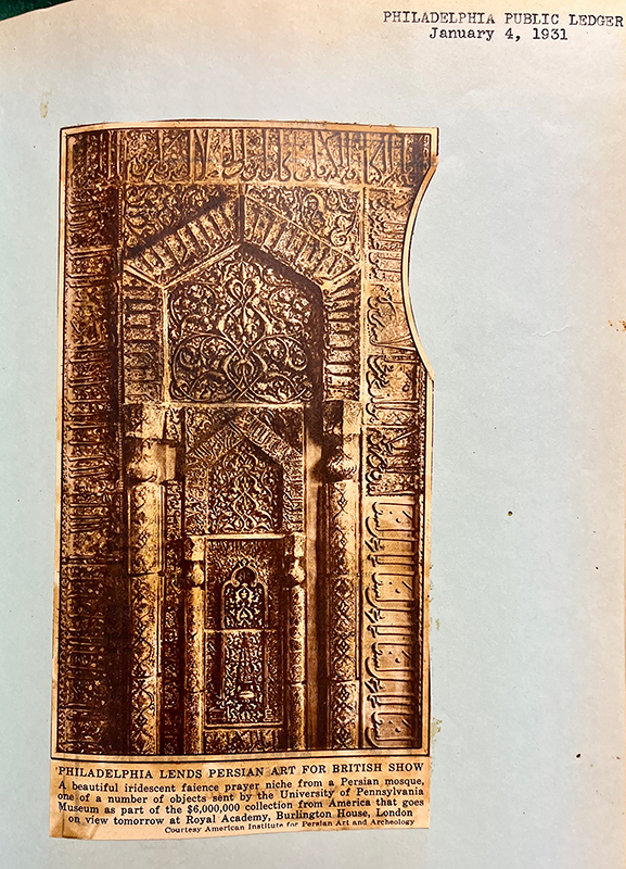 In late 1930, Kevorkian, Horace H. F. Jayne (d. 1975), the new director of the Penn Museum, and Myron Bement Smith (d. 1970), secretary of the American Institute for Persian Art and Archaeology, enter into negotiations about the mihrab’s inclusion in the pending International Exhibition of Persian Art in London (fig. 115). The Penn Museum agrees to cover insurance and shipping to New York, and the exhibition committee will cover all other expenses from New York to London and the return, if Kevorkian decides to bring it back to the United States.