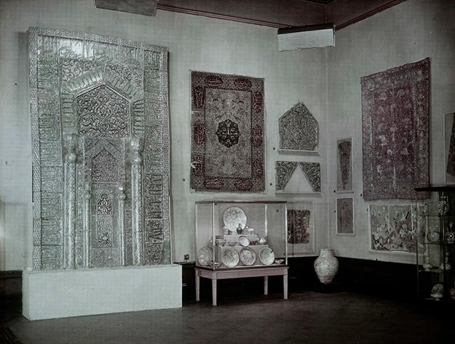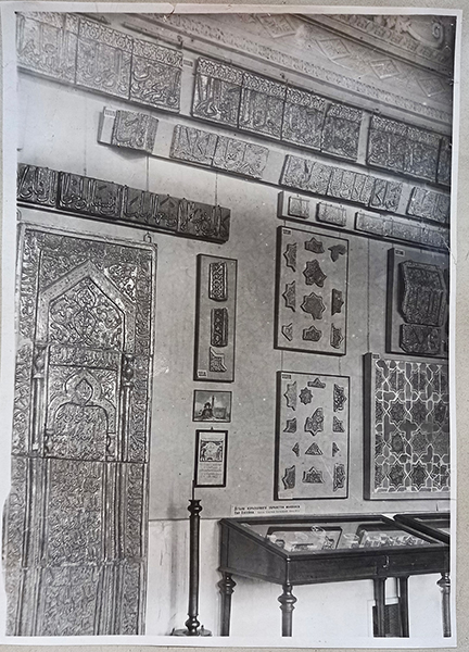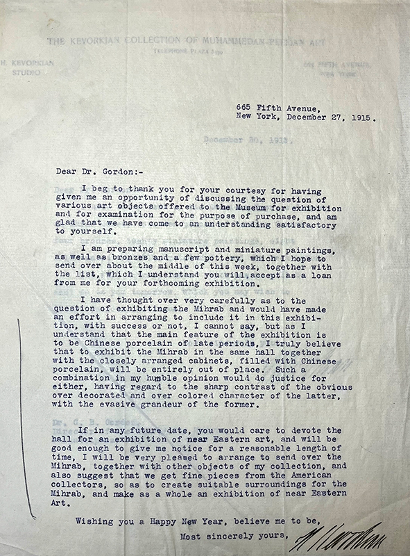 During the war, Kevorkian and Gordon stay in touch about several loans and purchases, and in December 1915, Gordon asks the dealer to send the mihrab to the museum for inclusion in an exhibition of Chinese porcelain. Kevorkian refuses this request, calling the display of the mihrab alongside Chinese porcelain “entirely out of place” (fig. 91). Instead, he proposes a future exhibition on “near Eastern Art” that would include the mihrab and other materials in his collection.