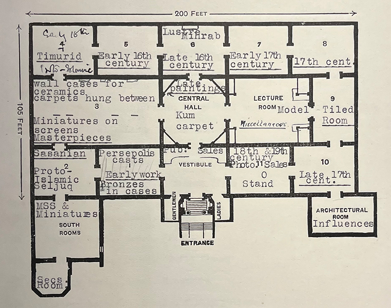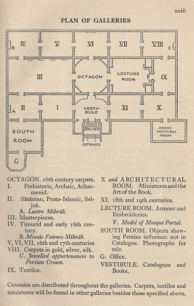 The exhibition includes over two thousand works of art lent by individuals and institutions from twenty-two countries, including Iran, and occupies almost all of the first floor of London’s Burlington House, part of the Royal Academy of Arts (map).154 The mihrab is displayed in a room at the back left (northwest) of the building, surrounded by carpets and luster tiles from different collections and sites (figs. 118–19). As in Philadelphia in 1918, it is elevated, but in this case, on a white pedestal. The mihrab’s importance to the exhibition curators is attested by an earlier plan of the galleries that positioned it on the main axis of the building, directly behind the central octagonal hall (figs. 120–21).