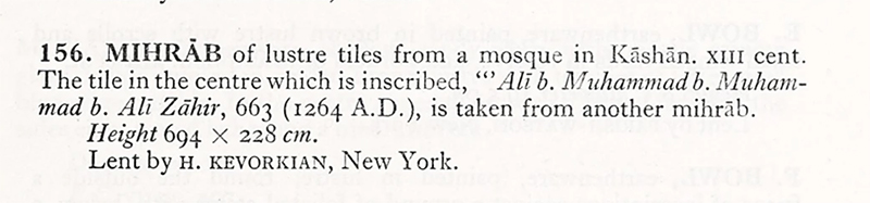 Kevorkian displays the Emamzadeh Yahya’s luster mihrab in an exhibition of his collection at the Galleries of Charles of London in New York (map) (fig. 85). The eight-page catalog entry describes the ensemble as “from the Seljoucid Temple at Veramin” and states, “The temple from which this Mihrab was taken is of an earlier date than the Mihrab itself, and it is therefore tolerably certain that this masterpiece was made under the orders of Hulagu as a part of his policy of restoration.”127 The allusion to the Mongol khan Hulegu (r. 1256–65) has no basis in fact and invoking him as the conqueror of the Abbasid caliphate (750–1258) likely functions to attract attention and exoticize the story. Despite this, the entry ends with a useful list of the mihrab’s Qur’anic inscriptions, which Kevorkian had also sent to Freer (see 1913). The mihrab is not illustrated, and the Emamzadeh Yahya is not named.