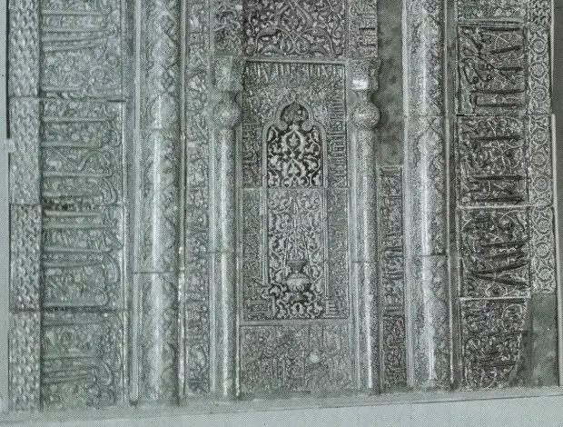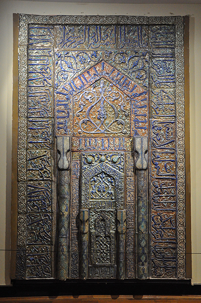 Largest among the exhibits is a mihrab or shrine, from a mosque of about the fifteenth century. It is about 12 feet high and entirely made out of highly glazed blue tiles. Texts from the Koran cover all the borders. It is a beautiful design, executed with much skill, and in its original setting must have been a remarkably gorgeous affair. It is only one of its kind which has escaped the ravages of Time.137