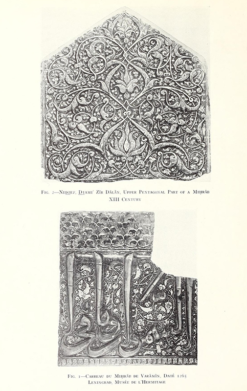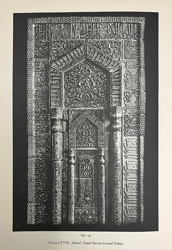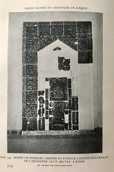 Kratchkovskaya’s article is preceded by two others on luster mihrabs: one by Dwight M. Donaldson on the two mihrabs in the tomb of Emam Reza at Mashhad (Checklist, no. 16) and one by Mehmet Aga-Oglu on the fragmented luster mihrab in a mosque in the Shrine of ʿAli at Najaf (see the hood in fig. 133). Donaldson reproduces a wide view of Emam Reza’s tomb showing its two mihrabs in situ, while Aga-Oglu attributes the Najaf mihrab to the workshop also responsible for “the Kevorkian miḥrāb in the University Museum, Philadelphia.”167 Considered together, the three Ars Islamica articles underscore a blossoming of scholarship on luster mihrabs in various guises—fragmented and relatively complete, in situ and in museums—and the centrality of the Emamzadeh Yahya’s mihrab in this research.