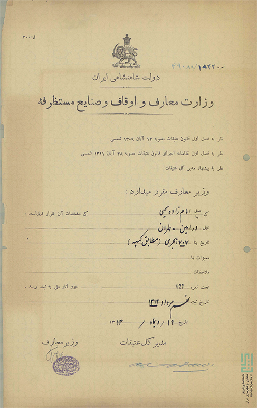 On 9 Mordad 1312 Sh/31 July 1933, the Emamzadeh Yahya is registered as a national heritage site and assigned the number 199. The registration of architectural monuments through the Zand era (1796) had been outlined in the Antiquities Law passed on 12 Aban 1309/9 November 1930. This law is referenced at the top of the shrine’s official declaration, which also notes that its registration was proposed by André Godard (d. 1965), the director of the Archaeological Services of Iran (مدیر کل عتیقات), and approved by Ali-Asghar Hekmat, Minister of Education (وزیر معارف) (fig. 130).