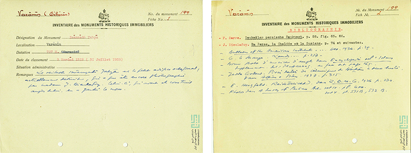 The Emamzadeh Yahya’s bilingual (Persian and French) inventory card records its name, location, date of construction (707 AH, from the stucco inscription), date of registration, and some remarks (fig. 131). The French card includes Godard’s handwritten notes, which presumably guided the Persian translation: