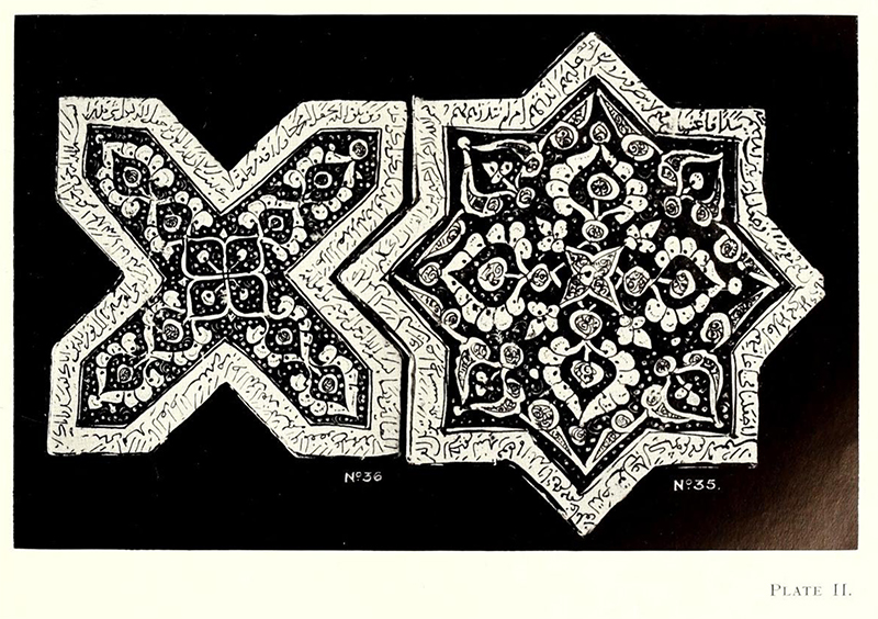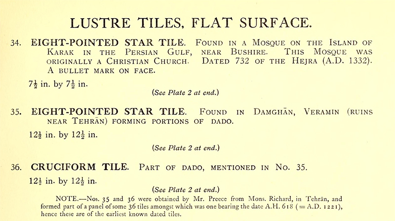 The Preece sale also includes two star and cross tiles from the Emamzadeh Yahya that are described as “found in Damghān, Veramin (ruins near Tehrān)” and “obtained by Mr. Preece from Mons Richard, in Tehran” (figs. 74–75).108 Instead of identifying the source building, the entry names another city—Damghan—that is nearly 200 miles northeast of Varamin (map).109 This careless approach to architectural origin is contrasted to the accurate attention to provenance (past ownership), and specifically the dealer Jules Richard (see 1875–76). Naming Richard undoubtedly served to lure buyers and increase the tiles’ monetary value.