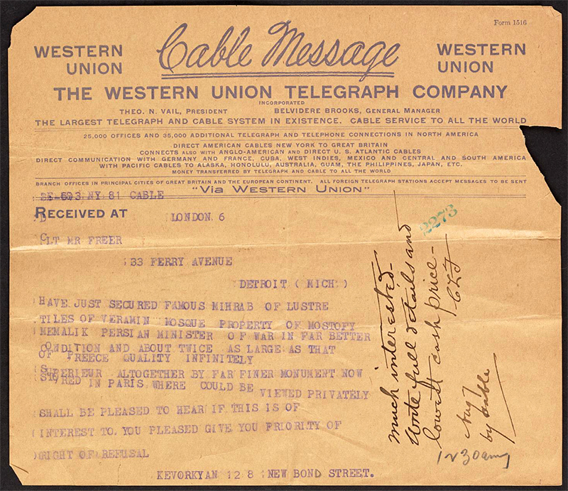 Shortly after concluding his negotiations with Mostowfi al-Mamalek, Kevorkian offers the Emamzadeh Yahya’s mihrab for sale to Detroit-based industrialist and collector Charles Lang Freer (d. 1919) (fig. 76). He first reaches out to the collector from London via telegram (fig. 77):