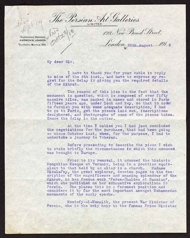 Have just secured famous mihrab of lustre tiles of Veramin mosque property of Mostofy Memalik [Mostowfi al-Mamalek] Persian Minister of War in far better condition and about twice as large as that of Preece [see fig. 73] quality infinitely superieur altogether by far finer monument now stored in Paris where could be viewed privately shall be pleased to hear if this is of interest to you pleased give you priority of right of refusal.