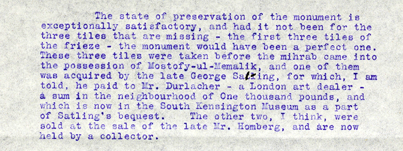 “In this connection and on account of my excellent relations with the Regent himself, I rendered services that have been appreciated by His Excellency [Mostowfi al-Mamalek] and in return he conceded the monument [mihrab] to me at a price for which it would have been impossible to obtain it.”