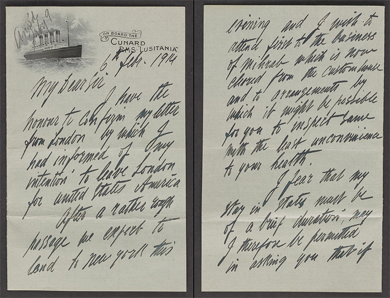On 6 February 1914, writing from aboard the RMS Lusitania, Kevorkian confirms that he is on his way to New York and that the mihrab has cleared customs and can be available for Freer’s inspection (fig. 82). He is also willing to transport the mihrab to Detroit if needed. Freer offers to come to New York in early March to see the ensemble, and on 12 February, writing from the Plaza Hotel, Kevorkian notes being pleased that Freer has no objection to it being exhibited—likely a reference to the dealer’s pending show in New York—and will “get it mounted and hope it will be ready.”123