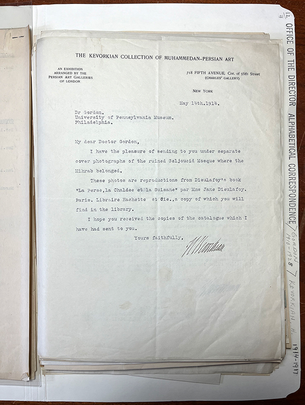 - “Objects in the museum which are the property of Mr. H. Kevorkian,” 17 February 1927, appended to a letter from the Secretary of the Board of Managers, Penn Museum, to Kevorkian, PMA. ↩
