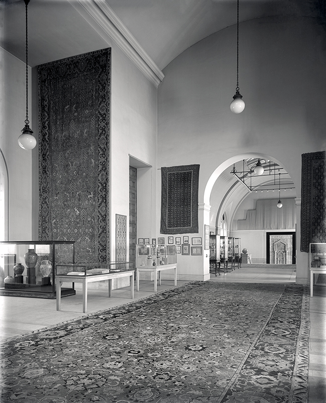 The mihrab is displayed for three and a half months in the Penn Museum’s “Exhibition of Mohammedan Art.” It is located at the far end of the exhibition in a stairway landing, elevated at the top of wooden steps, and placed in front of a black fabric in turn covering a door (fig. 97). Above the mihrab, more drapery covers a cast of the frieze of the Parthenon, part of the Classical galleries installed in 1899. The exhibition unfolds in the long gallery facing the mihrab, and the high ceilings accommodate several large carpets (fig. 98).