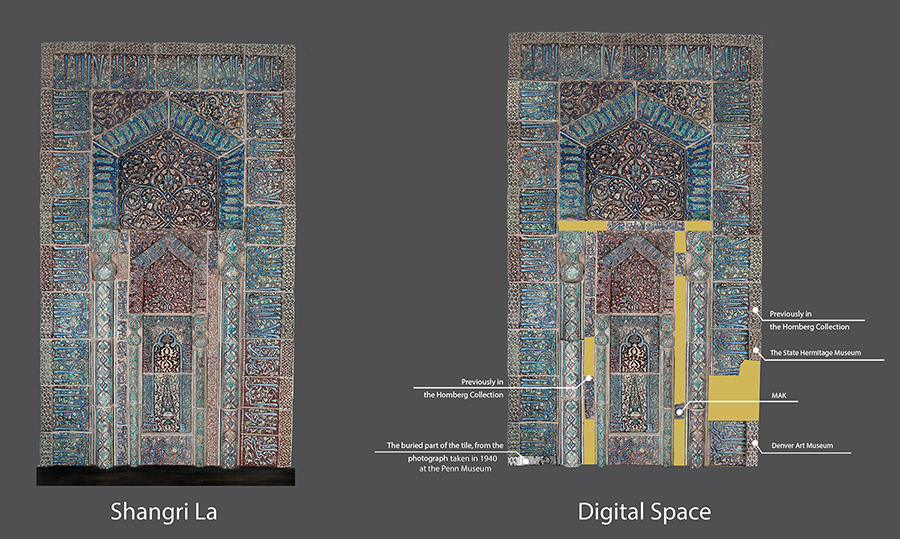 In a digital environment, we have the opportunity to reimagine and partially restore some of this inaccuracy and incompleteness. The visual timeline above begins with Dieulafoy’s photograph of the mihrab in situ and deliberately includes some of the surrounding qibla wall, which is notable for its soaring verticality, a stark contrast to the mihrab’s current claustrophobic setting. The final image—a digital visualization—achieves several goals (fig. 280). It moves currently jumbled tiles to their correct locations and re-places the three tiles in the lower right border (the tile in between those now in the Denver Art Museum and Hermitage remains to be identified). It also reconstitutes the inner border by indicating its original upper horizonal row, thus increasing the mihrab’s height and balancing its proportions, and reuniting the isolated tile now in the MAK. Finally, the buried tile on the lower left is reearthed and re-seen via an archival photograph. The virtually reunited tiles are labeled by their current repositories, and still missing pieces are left blank, with the hope that they might be found one day. The study of the Emamzadeh Yahya’s mihrab is by no means done or exhausted, and we will continue to add to its layers of understanding. Other museumized masterpieces might warrant similar revisitations and expansions.