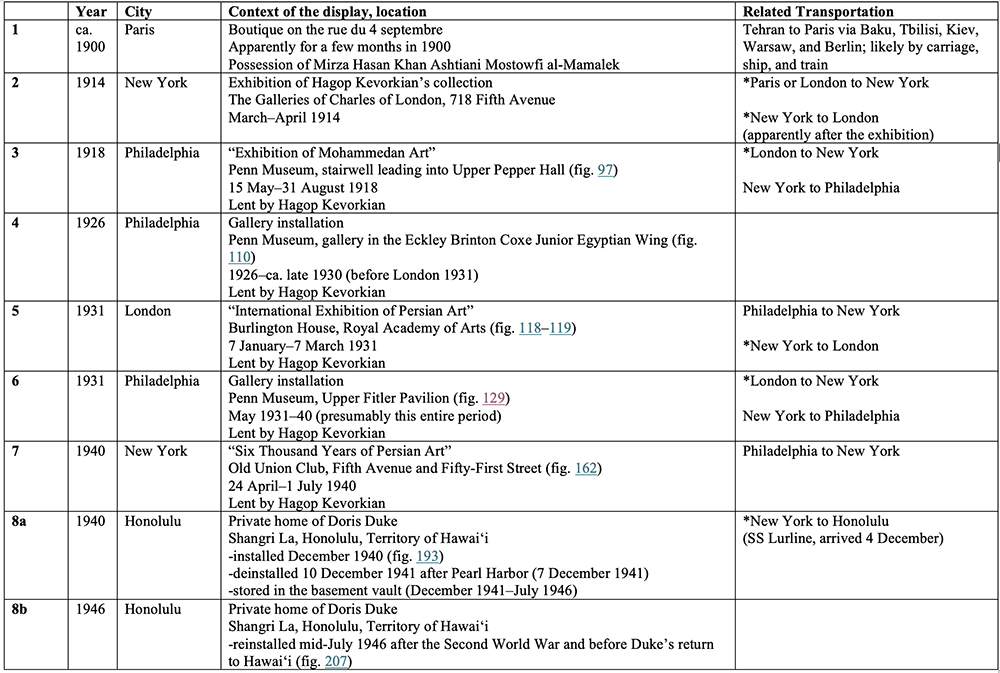 Chaotic circumstances in Iran during the last decades of the Qajar dynasty (1786–1925) created a vulnerable climate for cultural heritage. While Iranian officials and European elites profited off cultural patrimony, dealers initiated commercial digs throughout the country, especially on the Tehran plain around Rey and Varamin. One such dealer was Hagop Kevorkian, who purchased the Emamzadeh Yahya’s mihrab from Mostowfi al-Mamalek in 1912–13. The sale of the mihrab to a dealer launched the ensemble into a new phase of possession, one that prioritized its constant display and publication to increase its financial value and opportunities for sale. Under Kevorkian’s purview, the mihrab was displayed six times in twenty-six years in three cities (Table I).