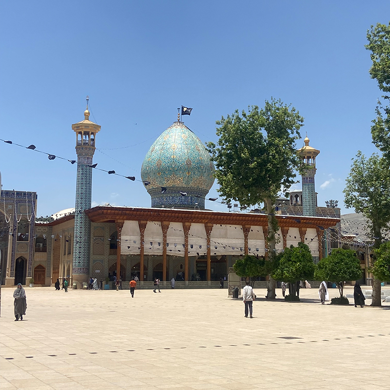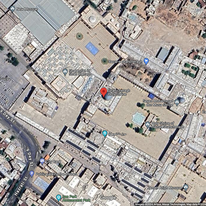 Shah Cheragh, located in the heart of Shiraz (map), is one of the most significant pilgrimage sites in Iran. The origin of the name ‘Shah Cheragh’ (King of the Light) is attributed to the discovery of a radiant tomb in the early twelfth century. According to tradition, the tomb belonged to Ahmad ibn Musa (d. ca. 819), the brother of Emam Reza and Fatemeh Maʿsumeh and son of Emam Musa Kazem. Ahmad ibn Musa is believed to have been killed by Abbasid soldiers while en route from Medina to Khorasan, and after his martyrdom in the early ninth century, his burial site remained hidden for more than a century.