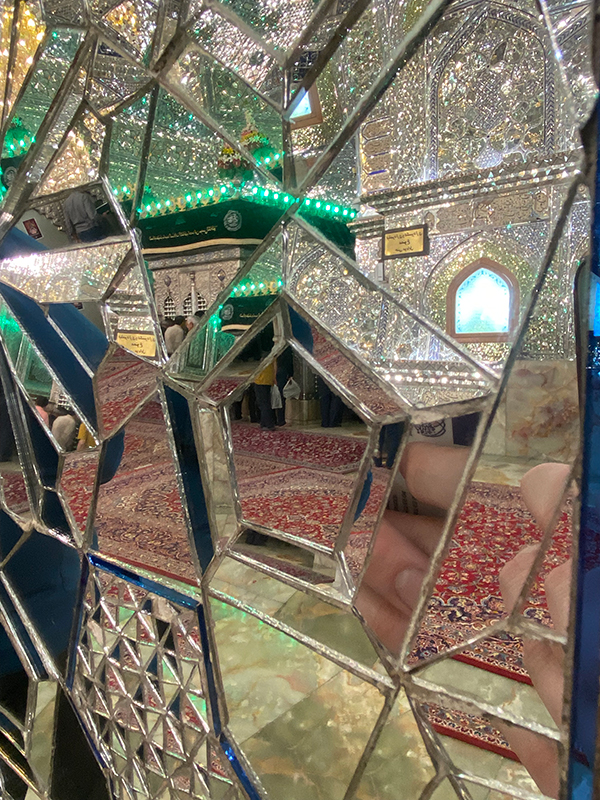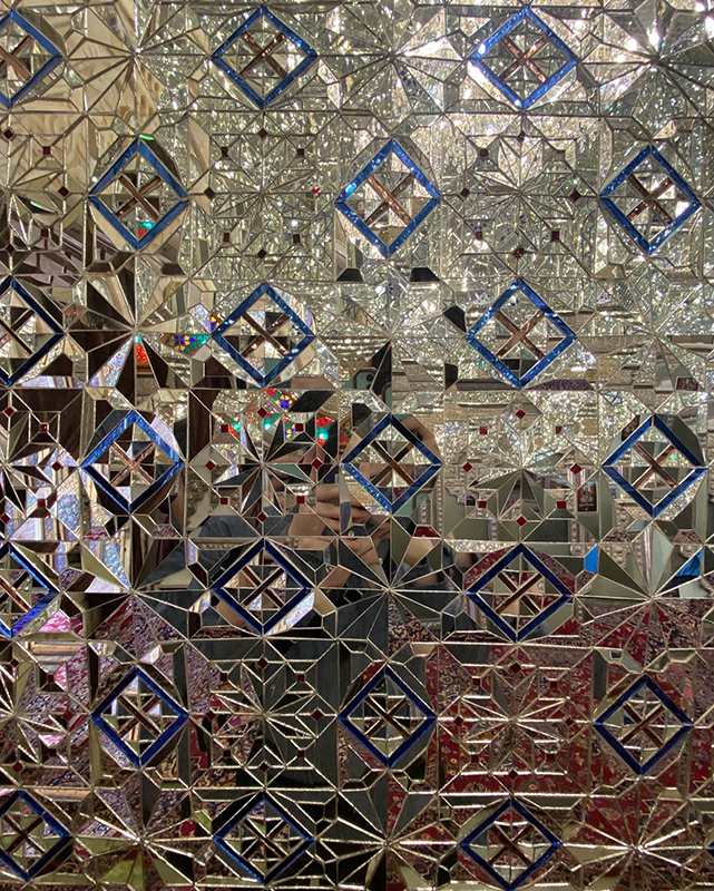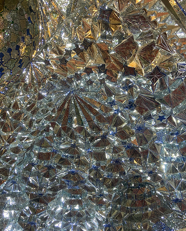 One cannot help but feel utterly humbled in the presence of the tomb’s larger-than-life dome, whose majestic ayeneh-kari casts a radiant light upon the visual and symbolic nexus of the sanctuary, the silver zarih (see main image above). This powerful sentiment of humility is further augmented by the actual fragmentation of the mirrors, which through obscuring our own reflection, summon us to lose attachment to our physical selves (fig. 7). In this regard, the ayeneh-kari of shrines like Shah Cheragh entirely destabilizes traditional western connotations of mirrors as emblems of vanity, superficial beauty, and even narcissism.