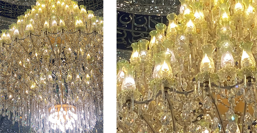 Weighing over three hundred pounds, the multi-tiered chandelier commissioned by Naser al-Din Shah (r. 1831–86) consists of a central brass body with arms extending outwards towards tulip lamps housing dimmed lightbulbs (fig. 6). In his account of the tomb based on his visit in 1883, the Qajar poet Forsat-e Shirazi (d. 1929) waxes lyrical about the lighting fixture: “The year one thousand two hundred and seventy-six [or 1859–60] is when the crystal chandeliers and abundant candles, each containing the essence of light and brightness, illuminated the eyes of the world and the spheres” (Forsat ol-Dowleh Shirazi, p. 445–46). Beyond its melodious poetry and confirmation of the chandelier’s date of installation, this observation reiterates the crucial role of lighting devices in sacred spaces and their interdependent relationship with ayeneh-kari.
