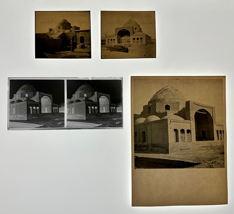 The André and Yedda Godard Archives at the musée du Louvre in Paris (map) (website) consist of about 13,000 photographs and 2,500 written documents and is one of the most important archives of Iranian architecture outside of Iran. For over four decades (1928–60), the Godards lived and worked in Iran and played an important role in the preservation, publication, and presentation of the country’s cultural heritage (see their page in Photographers). In this tour, archivists Alejandra Tafur Manrique and Martina Massullo take us behind the scenes of the archive and illuminate how it is preserved, stored, handled, and digitized for research purposes. Weaving between glass plate negatives, soft negatives, prints on paper, and slides, we provide a general tutorial on the material supports of photography while offering a deeper appreciation of six important photographs of the Emamzadeh Yahya taken in the 1930s after its major reconfiguration (see History of Evolution, Photo Timeline). We merely scratch the surface of the 86 photographs taken in Varamin, and we look forward to the archive’s open-access release in 2025, which is sure to have a major impact on the study of Persian art and architecture.