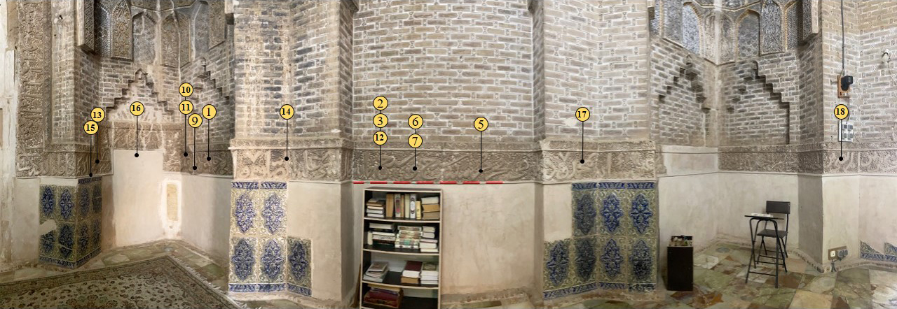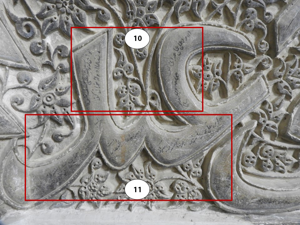 The most prominent theme among these verses is the expression of Shiʿi beliefs (numbers 6, 8, 10, 11, 14). Both of the selected verses of Khaju-ye Kermani (d. 1334) and Saʿdi (d. 1291) are on this subject (numbers 6, 10). The theme of Khaju’s selected poem, which is advisory in nature, invites the reader to follow the way of ʿAli ibn Abi Talib, the first Shiʿi Emam, in life. A small but interesting point about these verses is that they also mention a famous fourteenth-century poet and mystic: ʿAlaoddowleh Semnani (d. 1336), who was one of Khaju’s teachers and patrons. In this poem, he is an example of those who have chosen ʿAli’s path in life. The choice of such a verse also shows ʿAlaoddowleh’s fame and credibility among the people of the time. The date of the yadegari is illegible, but based on comparison with the writing style of other dated inscriptions in the building, it probably belongs to the sixteenth century.