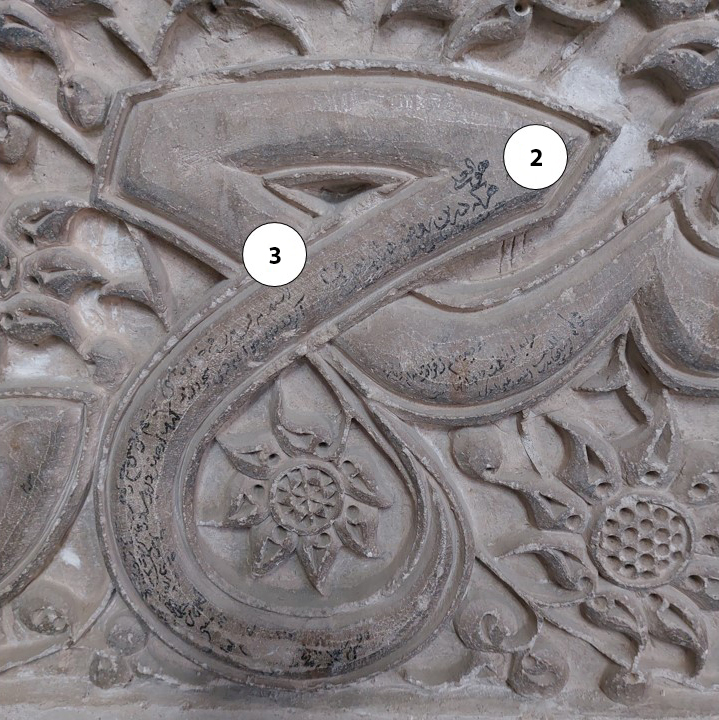 Note: Two more recent yadegari in pencil can also be seen on the stucco inscription and seem to have been written on the same day and in the same handwriting, merely to record the name and memory of the writer. One of the yadegari begins with the phrase “O ʿAli, help,” which is one of the most common prayers of dervishes and, of course, a Shiʿi phrase.