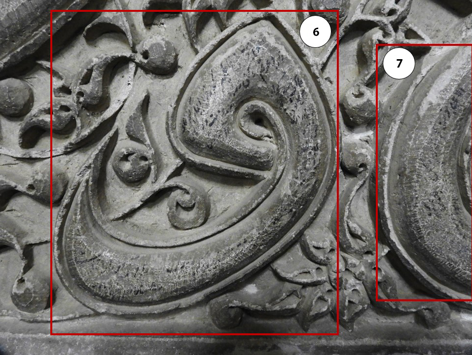 In the tomb of Emamzadeh Yahya, traces of a number of yadegari can be seen on the stucco inscription dated 707/1307. In the present project, we decided to document these yadegari as much as possible. Most of the yadegari are severely damaged, faded, and illegible. Through photography and digital image enhancement, we were able to read eighteen yadegari, albeit incompletely. The surviving yadegari are mostly on the west side of the stucco inscription (fig. 12). As can be seen in the panoramic photographs, the stucco inscription on the east has been partially repaired and plastered during recent restoration, and it is possible that this section previously had more yadegari (fig. 13). In the future, perhaps more of these wall writings can be identified in other parts of the building and added to this collection.