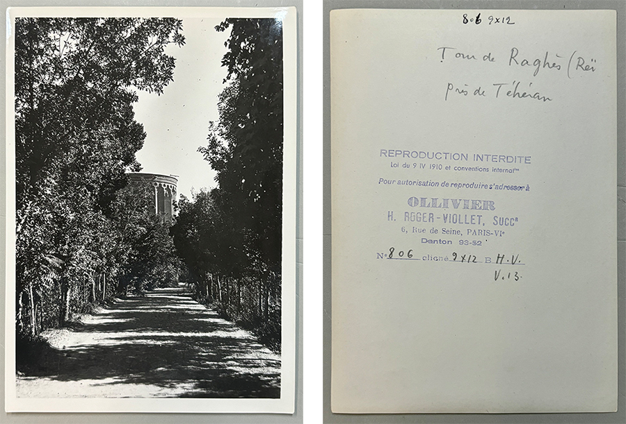L’intérêt d’Hélène Roger pour l’Iran lui vient peut-être de sa famille. Son oncle Henry Viollet (m. 1955), archéologue, architecte, voyageur et photographe de renom, a visité l’Iran en 1911–13 et pris de nombreuses photographies (voir ses archives à la BULAC). Henry Viollet diffusait ses prises de vue chez Laurent Ollivier, au 6 rue de Seine (carte), et lorsque Hélène Roger et Jean-Victor Fischer reprennent le magasin en 1938, ils reprennent naturellement la diffusion de ce fonds (figs. 4–5).